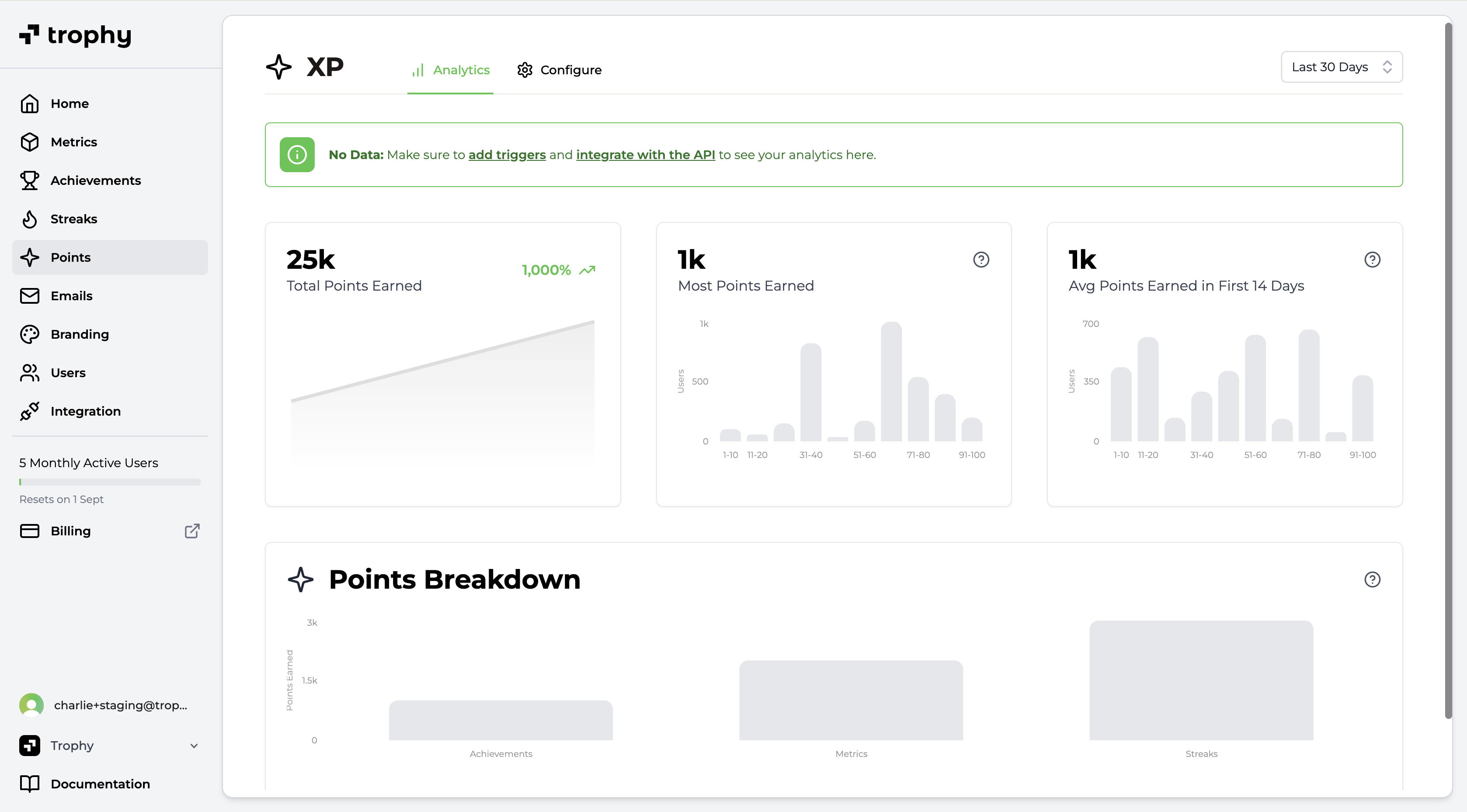 Trophy has built-in analytics to track points awards for each points system you configure across your users in real time including:- Total points earned by all users over time