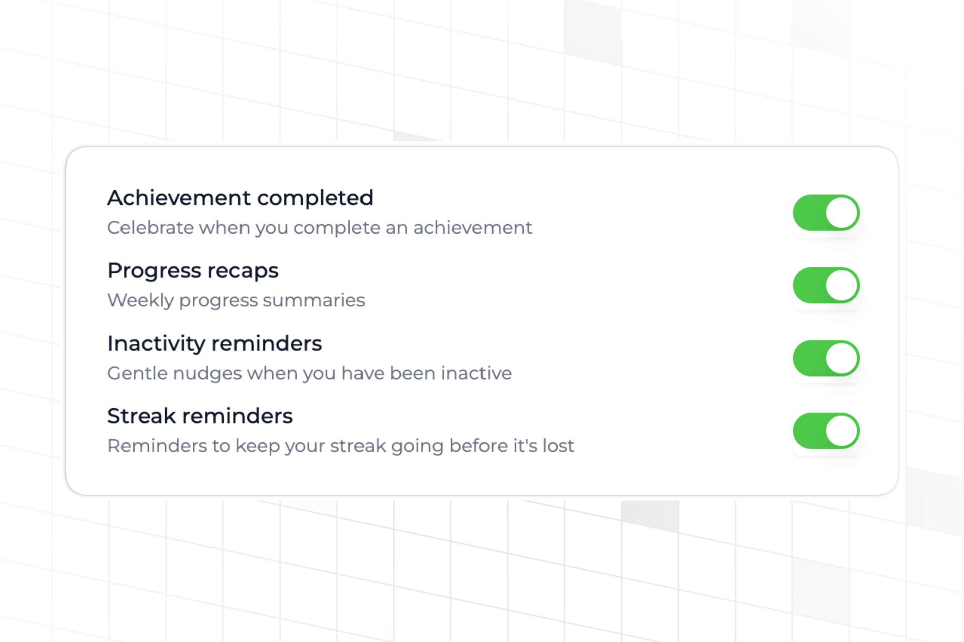 • streak_reminder: Reminders to help users maintain their streaks